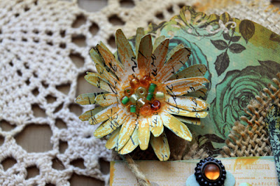 I then took the Large Daisy Stamp from The Rubber Cafe and stamped two images, onto some of the printed Prima paper using Tim Holtz Wild Honey Ink and then fussy cut the flowers out and stacked them together and then added seed beads to the center with some Scrap Happy Glue and the Stick Em' Up tool to place all those tiny little beads into place. I then cut a piece of Kaisercraft Madame Boutique paper to fit the pocket and punched the top and stained the edges, and tucked it into the pocket for color and visual interest. You now have a sweet Vintage look favor bag that you can tuck tea bags, candy, jewelry or any small treat that you wish to put a smile on your Mom's face.