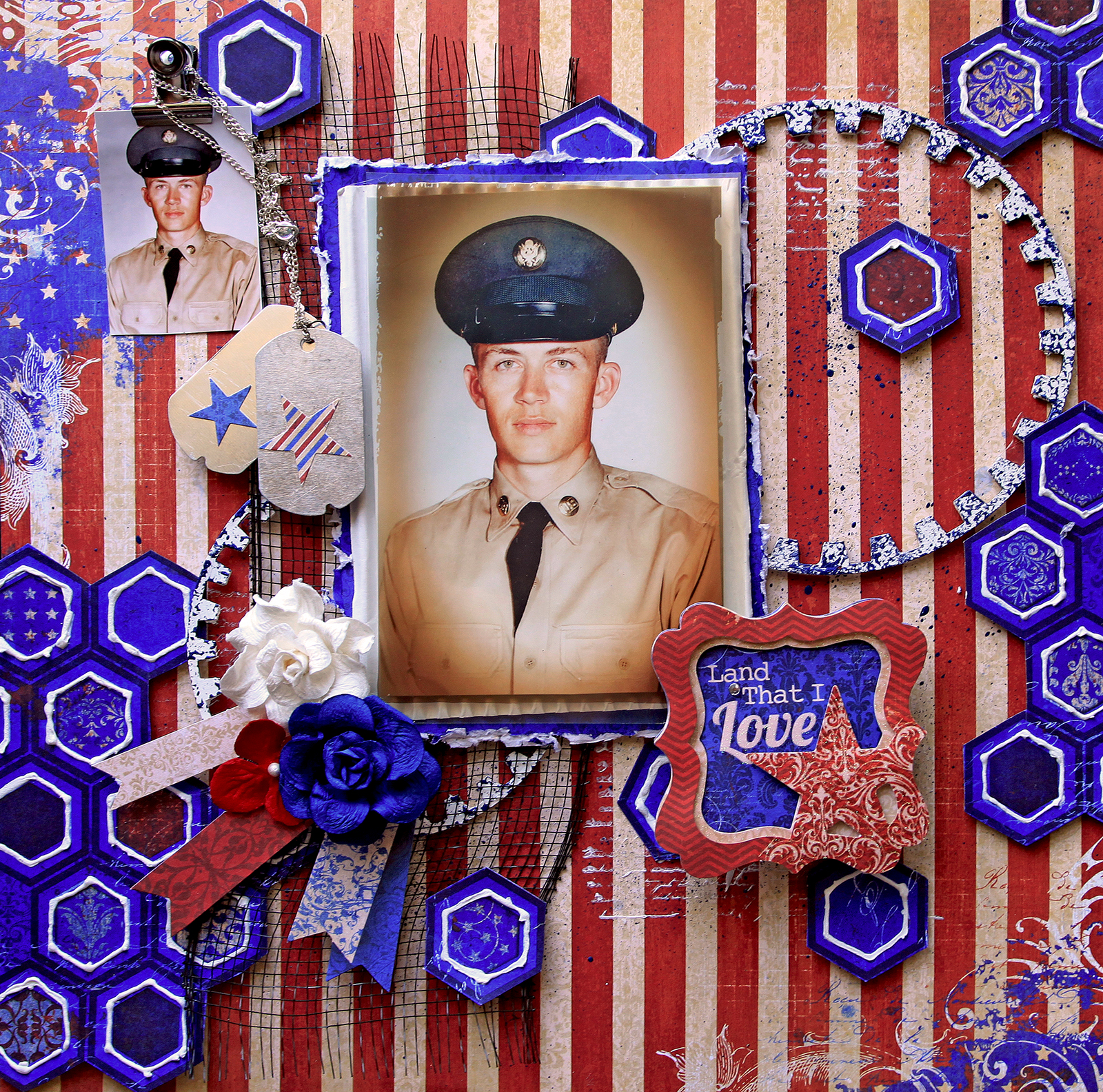 I double layered the paper from the kit, then I cut into the "boards" on the paper, and did some paper rolling, and some punching. I then took the stencil and mist from this month's Color Add On and lightly created a pattern on the background. I layered and distressed more layers of paper and matted the photo onto it.