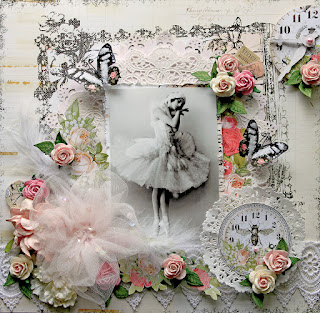 This next layout shows the more artisitic, mixed media side to the kit. It was completely inspired by the photo that I found from the Russian Ballet Company. I just love the lines of the Ballerina, and the striking colors of her tutu.
