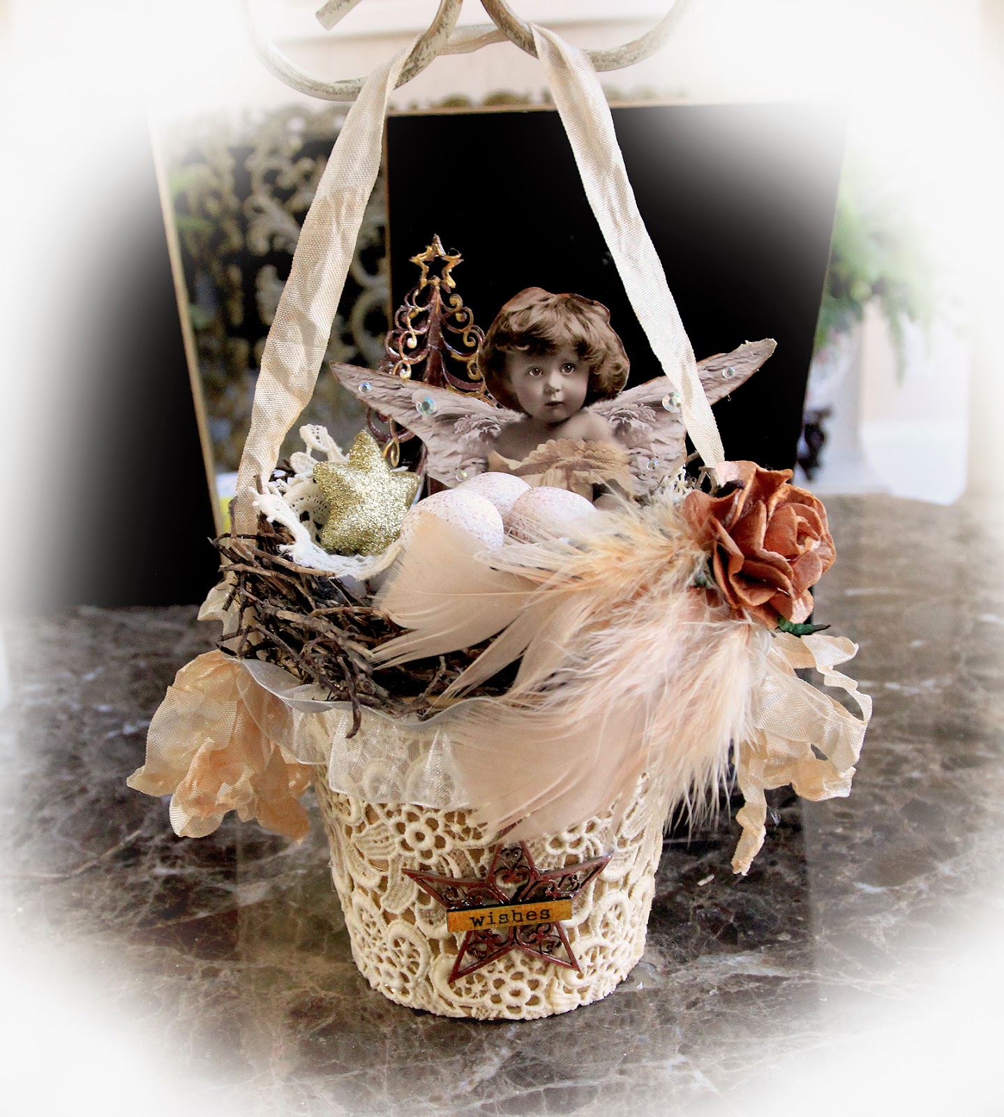 I am an avid hiker, and in the Winter after all the nests have been deserted, I love to collect real bird's nests for my art and to decorate with. I tucked one of my little nests into the bucket, added feathers and a large flower, then tucked in some more lace, little hand crafted and painted, paper clay eggs, a little "angel" that I digitally color altered and added wings to, a glittered up star ornament and a Scrapmatts